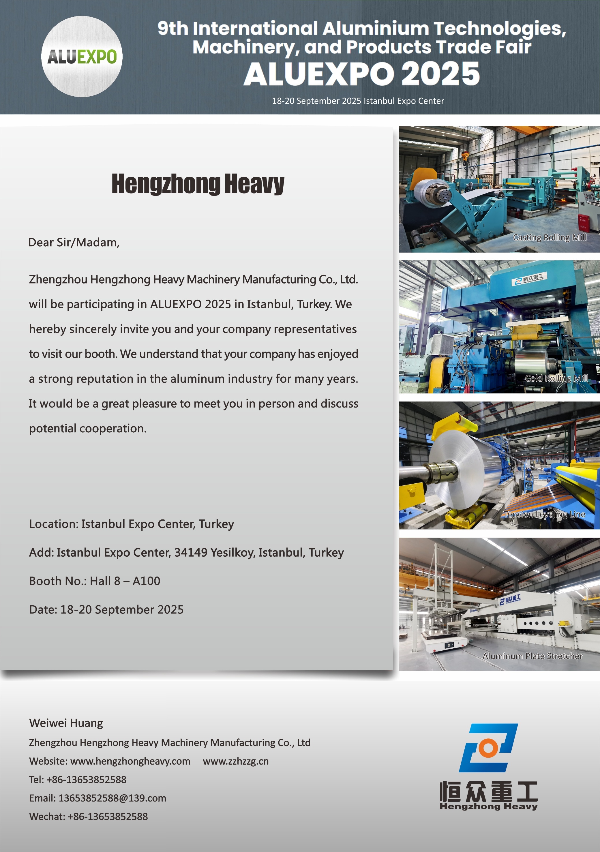 Zhengzhou Hengzhong Heavy Machinery Manufacturing Co., Ltd. is pleased to announce its participation in the 9th International Aluminium Technologies, Machinery, and Products Trade Fair (ALUEXPO 2025), to be held at the Istanbul Expo Center from 18–20 September 2025.