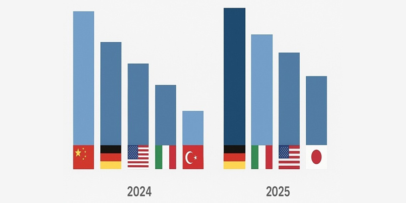 In terms of export value growth, Germany rose 23.96%, Italy surged 76.59%, the United States increased 31.06%, and Turkey nearly doubled with a 93.43% increase. Japan entered the top five in 2025, while China dropped out after leading in 2024.